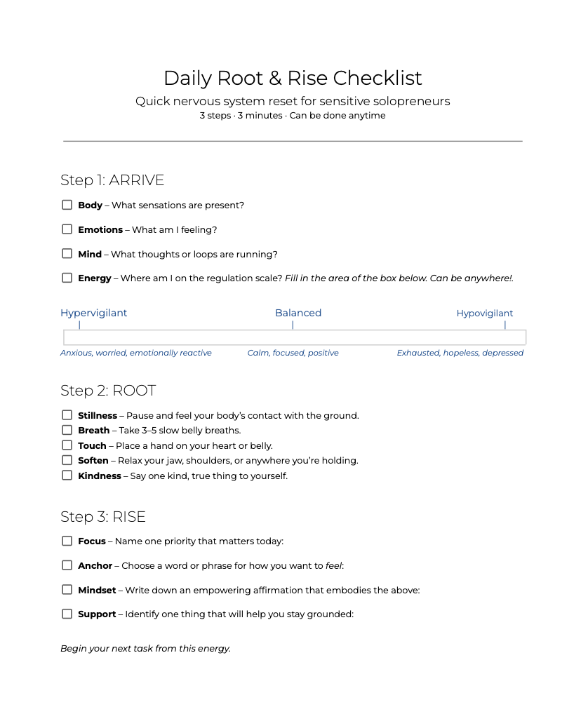 Download the free Daily Nervous System Checklist — a 5-minute reset to shift out of hustle mode and lead your business from calm embodied confidence.